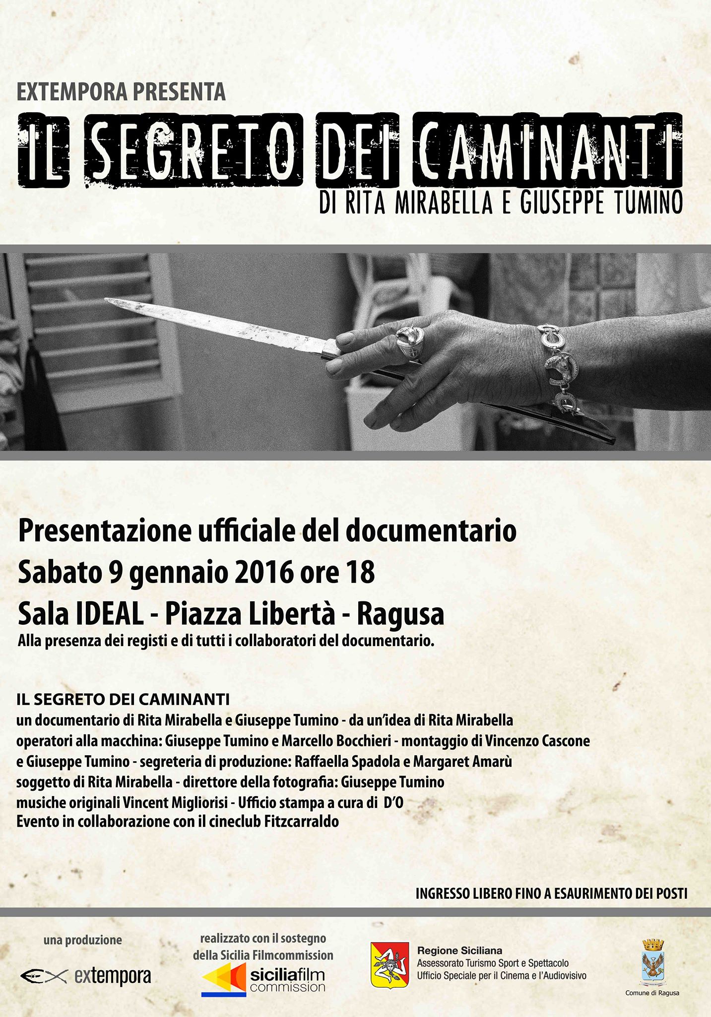 News Sicilia: sarà proiettato in anteprima nazionale al cinema Ideal di Ragusa, sabato 9 gennaio alle ore 18 “Il segreto dei Caminanti” di Rita Mirabella e Giuseppe Tumino. Prodotto da Extempora con il sostegno della Sicilia Filmcommission – Regione Siciliana, Assessorato Turismo Sport e Spettacolo, il documentario nasce da un’idea di Rita Mirabella, maturata dopo anni di stud ie reportage fotografici sulla vita degli itineranti siciliani, oggi concentrata principalmente nel siracusano, tra Noto e Priolo, e in provincia di Caltanissetta.Realizzato senza filtri ideologici, lontano da qualsiasi suggestione romantica o folcloristica.