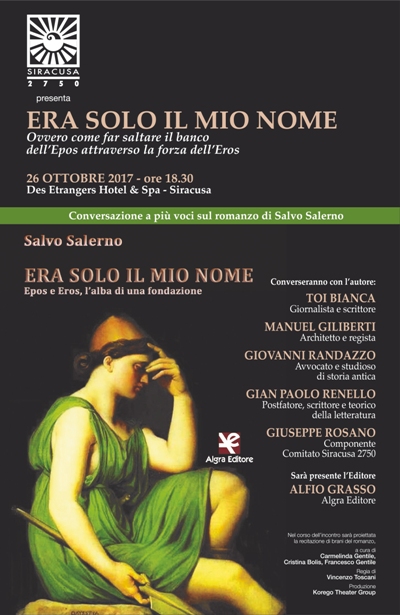 News Siracusa: nel quadro delle iniziative e manifestazioni per le celebrazioni del 2750° anniversario dalla fondazione di Siracusa, il Comitato Siracusa 2750° ha organizzato per il 26 ottobre, alle ore 18,30, presso i saloni dell’Hotel Des Etrangers, l’evento denominato “Era solo il mio nome, ovvero come far saltare il banco dell’Epos attraverso la forza dell’Eros”, conversazione a più voci intorno al romanzo-saggio di Salvo Salerno “Era solo il mio nome”, dedicato alla fondazione di Siracusa.