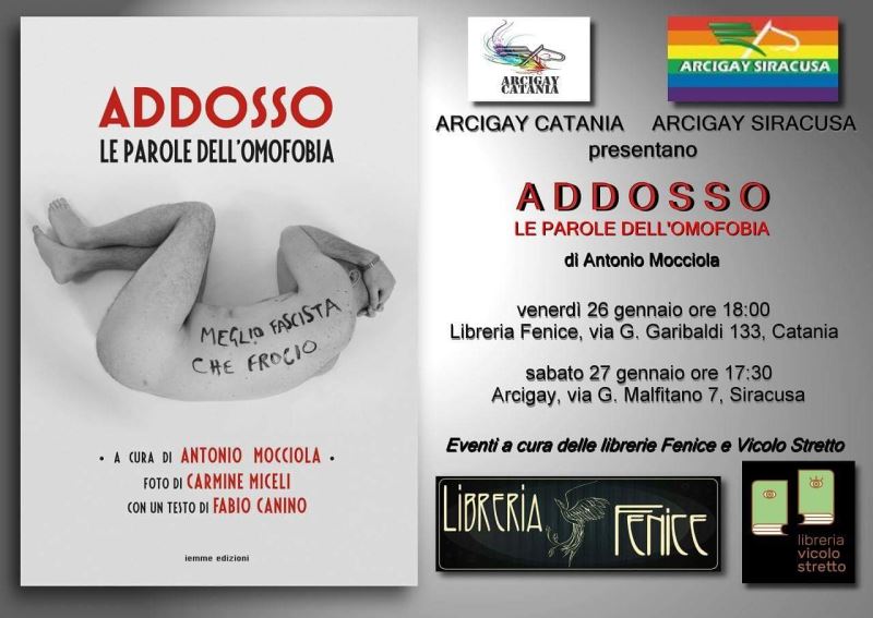 Incontro voluto fortemente da Arcigay Catania con la collaborazione di Arcigay Siracusa e curato in sinergia dalle librerie Fenice e Vicolo Stretto dove sarà presentato il libro “Addosso le parole dell’omofobia” di Antonio Mocciola.