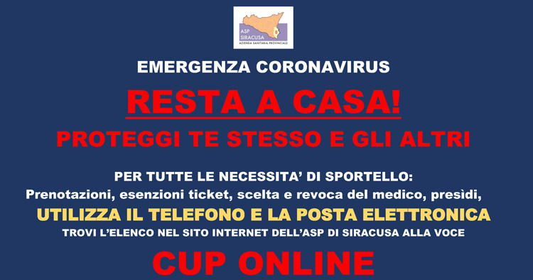 News. La direzione dell’Asp di Siracusa ha esortato caldamente tutti i cittadini appellandosi al senso civico a restare a casa e ad utilizzare per le necessità di servizi sanitari di Sportello indifferibili e urgenti il telefono e la posta elettronica il cui elenco completo e le modalità sono dettagliati nel sito internet aziendale nella sezione CUP ONLINE.