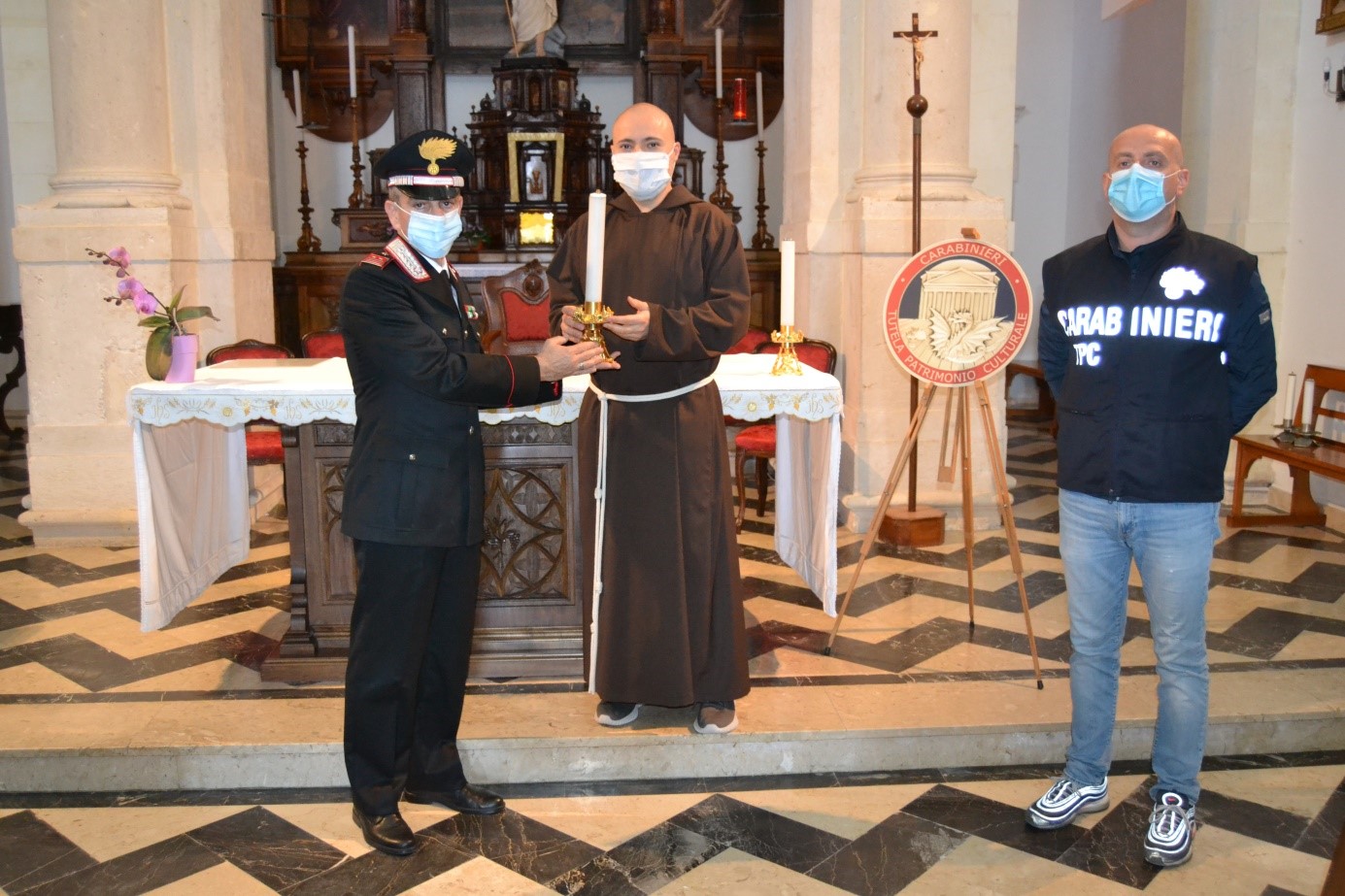 I due Candelieri sono stati già restituiti alla parrocchia. L’attività di polizia giudiziaria si inserisce nell’ambito di un consolidato rapporto di collaborazione e sinergia intrapreso negli anni tra il Comando Carabinieri Tutela Patrimonio Culturale e la Conferenza Episcopale Italiana che ha portato alla elaborazione, nel 2014, delle “Linee guida per la tutela dei beni culturali ecclesiastici” che, oltre a contenere consigli pratici per la difesa di oggetti ed opere d’arte sacra custoditi all’interno dei luoghi di culto da eventi predatori, diffondono e valorizzano le iniziative di catalogazione e censimento dei beni appartenenti alle Diocesi che, con grande impegno, stanno conducendo in ordine al proprio patrimonio culturale.