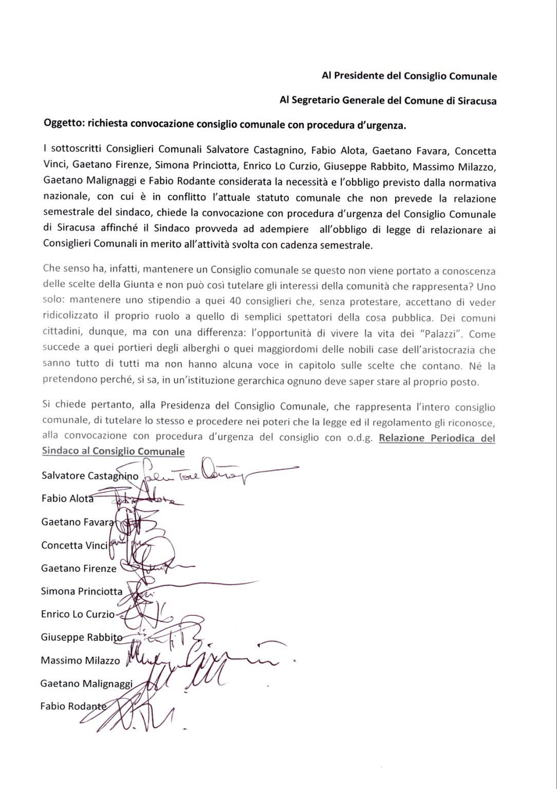 News Siracusa: l’opposizione unita ha firmato e depositato, nella giornata di ieri, a mezzo PEC la richiesta di convocazione di un consiglio comunale urgente con o.d.g. “relazione semestrale del Sindaco”.