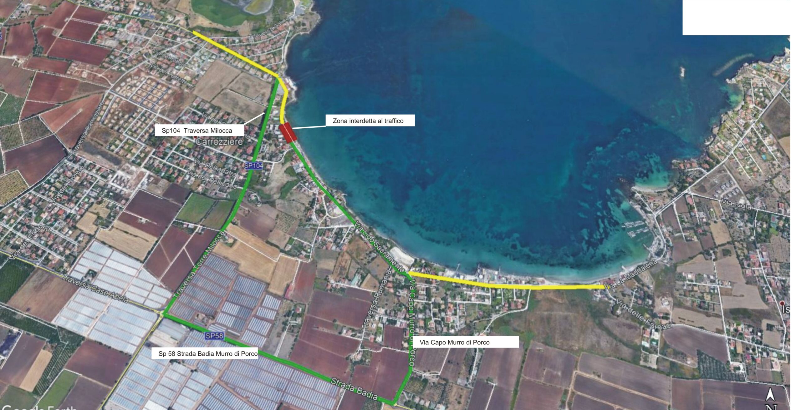 Sarà garantito il transito locale in via Lido Sacramento, nel tratto interposto tra strada Capo Murro di Porco (S.P. 58) e il civico 94 e nel tratto interposto tra strada Torre Milocca (S.P. 104) e il civico 90.