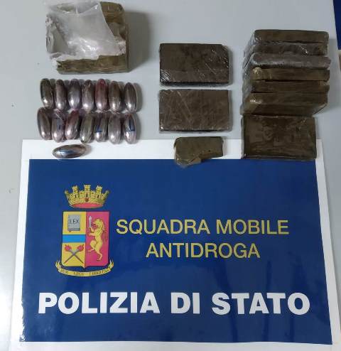 Gli Agenti della Squadra Mobile hanno notato, nei pressi di Via San Guglielmo Abate, una consegna di droga (due panetti di hashish) tra F.A. ed P.U. Prontamente intervenuti, i poliziotti hanno bloccato i due ed hanno effettuato una ricognizione delle campagne adiacenti rinvenendo e sequestrando 7 panetti e 15 ovuli della stessa sostanza stupefacente.