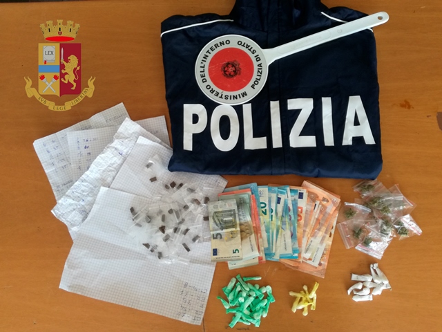 Nell’androne da dove erano fuggiti i due pusher gli agenti rinvenivano la droga ed i proventi dello spaccio: 47 dosi di cocaina per 14 grammi, 36 dosi di hashish per grammi 22 e 12 dosi di marijuana per 6 grammi, oltre a circa 1150 euro e vario materiale per il confezionamento dello stupefacente.
