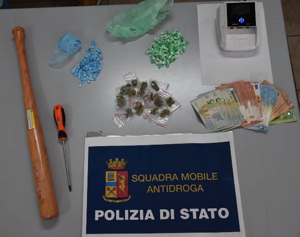 A seguito di perquisizione personale, cui è stato sottoposto l’arrestato, gli investigatori della Squadra Mobile hanno rinvenuto e sequestrato 124 dosi di cocaina, 18 dosi Marijuana, un rilevatore elettrico per il controllo delle banconote, una mazza da baseball in legno e 830 euro in contanti.