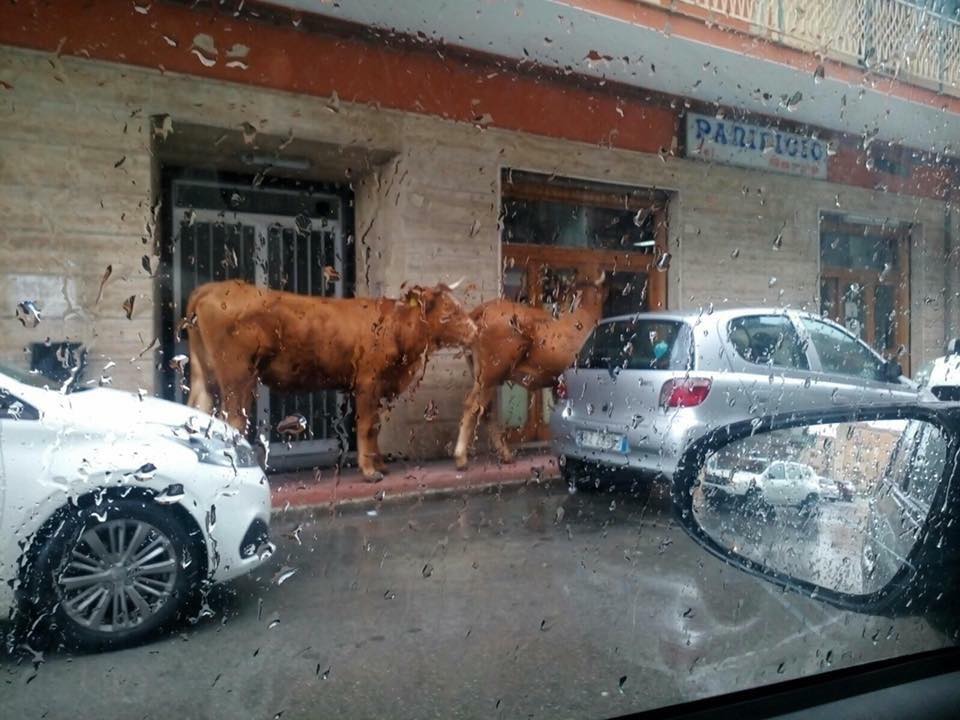 In zona Santa Panagia è stata avvisata una coppia di mucche che, probabilmente allontanatesi troppo da casa, dovendo affrontare le precipitazioni intense di questi giorni, hanno provveduto riparandosi sotto un balcone. Passanti e automobilisti non hanno potuto fare a meno di notare i due animali di grossa taglia che se ne stavano, con fare indisturbato, sul marciapiede. La foto in breve tempo è stata condivisa e commentata sui social, scatenando l’ironia e la fantasia degli utenti.