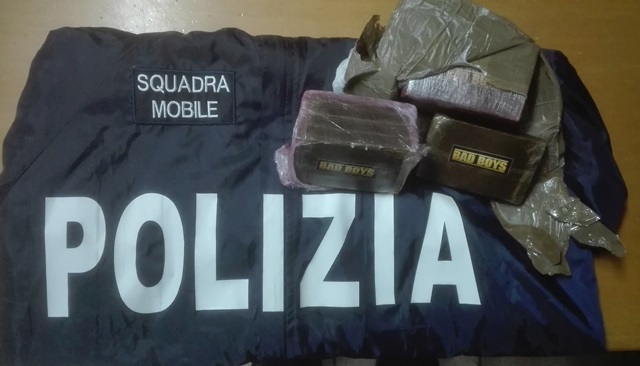 Gli investigatori della Squadra Mobile, nell’ambito di predisposti servizi finalizzati al contrasto dello spaccio di sostanze stupefacenti, hanno operato un controllo su strada all’autovettura condotta dall’arrestato che consentiva di rinvenire e sequestrare dieci panetti di hashish per un peso complessivo di un chilogrammo.