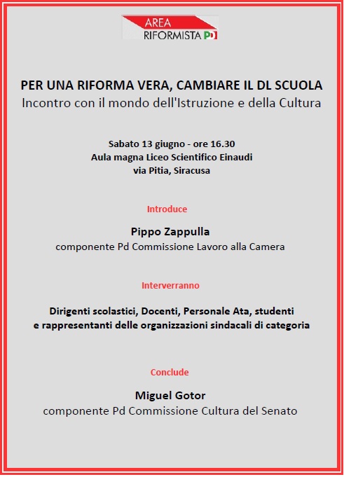 News Siracusa: Si terrà dopodomani, sabato 13 giugno, alle 16.30, nell’aula magna del liceo scientifico Einaudi di via Pitia a Siracusa, l’incontro organizzato dall’Area riformista del Pd sul dl scuola.