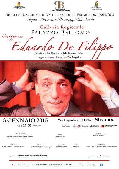 News Siracusa: andrà in scena domani alle ore 17.30 presso la Galleria Regionale di Palazzo Bellomo a Siracusa lo spettacolo teatrale multimediale “Omaggio a Eduardo De Filippo” per la regia di Agostino De Angelis.