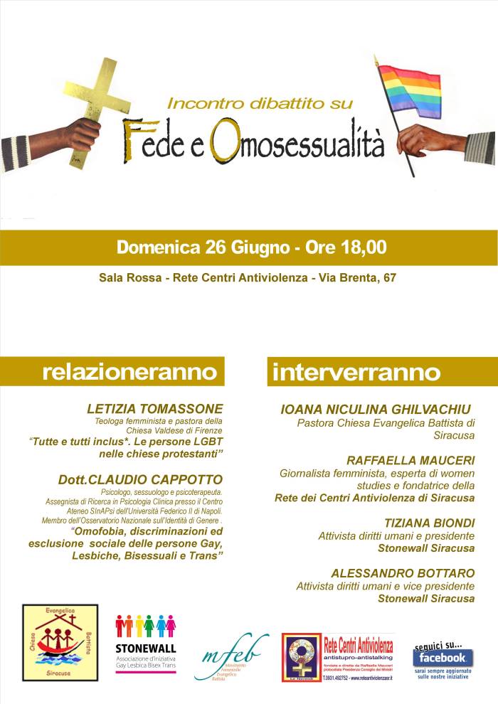 Letizia Tomassone, teologa femminista e pastora della Chiesa Valdese di Firenze e Claudio Cappotto, psicologo, sessuologo e psicoterapeuta. Interverranno: Ioana Niculina Ghivalchiu, pastora Chiesa Evangelica Battista di Siracusa, Raffaella Mauceri, giornalista femminista, esperta di women studies e fondatrice della Rete dei Centri Antiviolenza di Siracusa, Tiziana Biondi, attivista dei diritti umani e presidente Stonewall GLBT Siracusa e Alessandro Bottaro, attivista diritti umani e vice presidente Stonewall GLBT Siracusa.