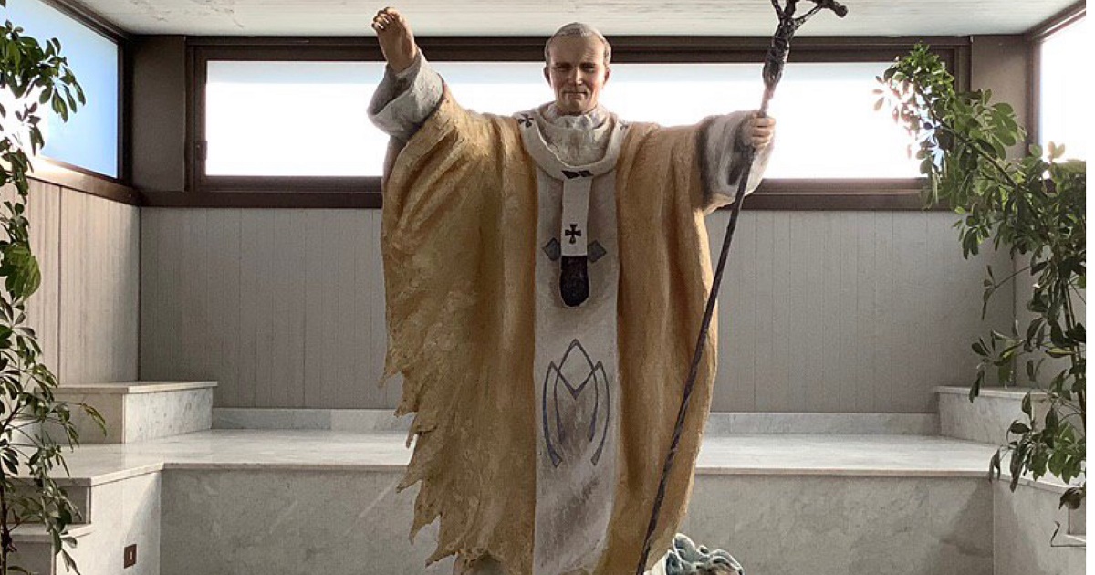 News Siracusa. A cento anni dalla nascita del Santo Papa Giovanni Paolo II, don Mimmo Minafra di Bari e il professor di Canicattini Bagni, Tanino Golino hanno donato alla Basilica Madonna delle Lacrime una statua che ritrae il Papa con i paramenti utilizzati per la Dedicazione del Santuario il 6 novembre 1994.
