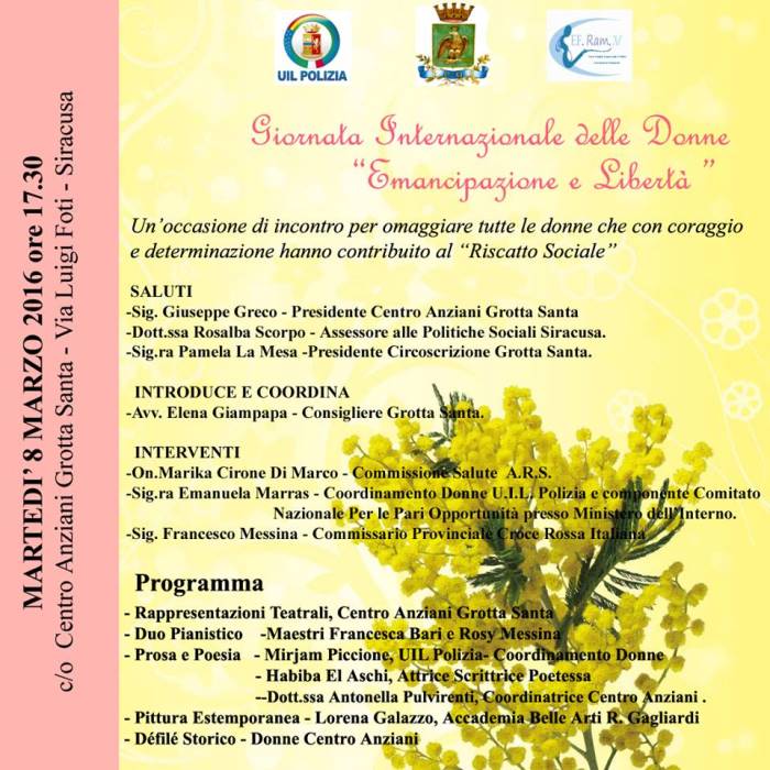 “La Circoscrizione Grottsanta – dichiara la presidente La Mesa – in sinergia con la UIL Polizia e l’associazione EF.Ram.M. ha organizzato questo evento per ricordare i traguardi che le donne hanno fin qui conquistato omaggiandole con un momento di riflessione tra musica, arte, poesia e recitazione”.