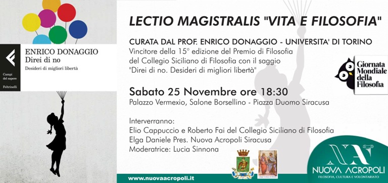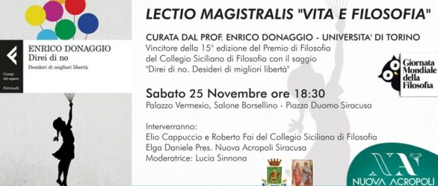L’appuntamento attesissimo di quest’anno è la Lectio Magistralis del prof. Enrico Donaggio dell’università di Torino, vincitore della XV edizione del premio di filosofia del Collegio Siciliano di Filosofia con il saggio “Direi di no. Desideri di migliore libertà” edito da Feltrinelli.