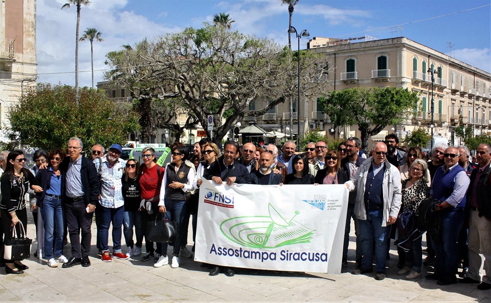 In largo XXV Luglio, al sit-in organizzato dall’Assostampa di Siracusa, decine di giornalisti arrivati da tutta la provincia e delegazioni giunte da Ragusa e Catania. Presente il segretario regionale di Assostampa Sicilia, Roberto Ginex, che ha voluto portare personalmente la vicinanza dei colleghi siciliani e il sostegno del sindacato.
