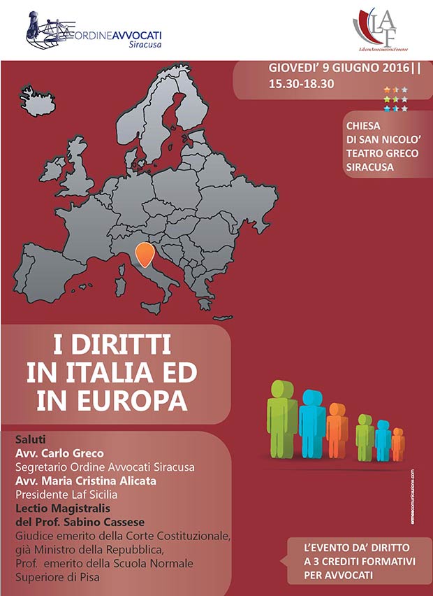 News Siracusa: giovedì 9 giugno alle ore 15.30 si terrà, presso la Chiesa di San Nicolò di Largo dell’Anfiteatro (all’ingresso del Parco Archeologico della Neapolis), l’incontro dal titolo “I diritti in Italia e in Europa”, organizzato dalla Sezione di Siracusa della Libera Associazione Forense Sicilia in collaborazione con il Consiglio dell’Ordine degli Avvocati di Siracusa.