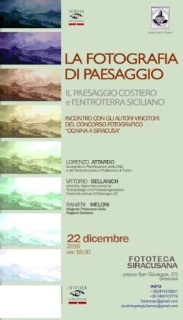 News Siracusa: giovedì 22 dicembre, alle ore 18,30, presso la Fototeca Siracusana, in piazza S. Giuseppe, n. 3, dove è stata allestita la mostra fotografica del concorso “Ognina a Siracusa, paesaggio costiero ed entroterra”, promosso dallo Studio legale Giuliano, si terrà un incontro dal tema “La fotografia di paesaggio. Il paesaggio costiero e l’entroterra siciliano”.