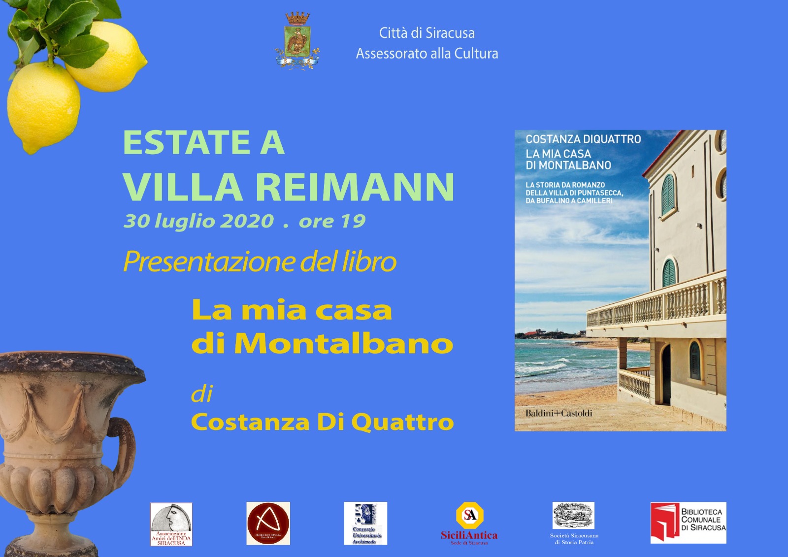 Continua la rassegna “Estate a Villa Reimann” organizzata dall’assessorato alle Politiche culturali in collaborazione con la Biblioteca comunale, Sicilia Antica, Archeoclub, associazione Amici dell’Inda, Consorzio Universitario Archimede e Società Siracusana di Storia Patria.