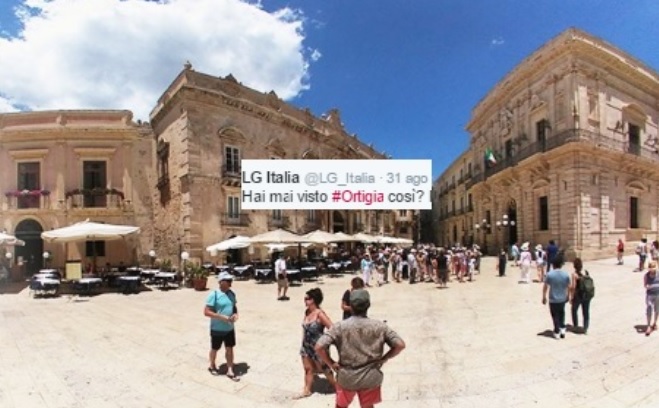 News Siracusa: “Hai mai visto Ortigia così?” E’ lo slogan che LG sceglie per sponsorizzare i suoi prodotti. Il noto marchio, dedicato alla telefonia e alla tecnologia, ha scelto Piazza Duomo come location per sponsorizzare una nuova fotocamera a 360 gradi. Il risultato è una spettacolare panoramica nel cuore del centro storico. Una giornata come le altre, tra turisti e siracusani, avvolti in uno scatto che racconta bellezza di piazza Duomo. Ancora una volta Siracusa è l’ispirazione per raccontare le grandi aziende internazionali, con spot, video, foto e reportage dal risultato incredibile.