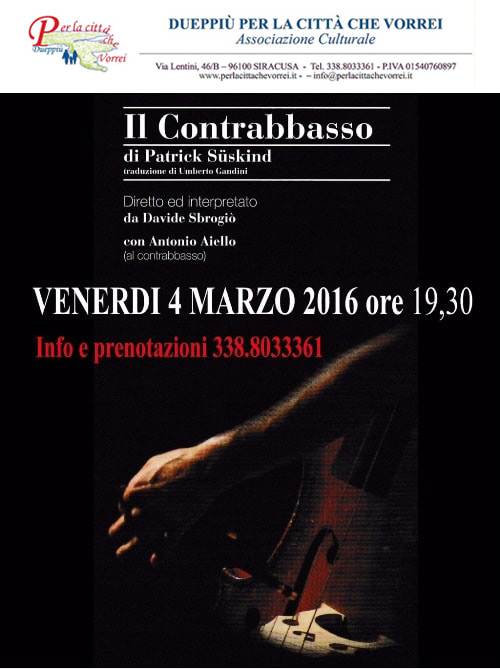 News Siracusa: venerdì 4 marzo, dalle ore 19.30 all’Istituto Musicale Privitera, andrà in scena “Il Contrabbasso” di Patrick Suskind. Lo spettacolo, diretto ed interpretato da Davide Sbrogiò e Antonio Aiello al contrabbasso ed organizzato dall’Associazione “Dueppiù per la città che vorrei”, è già andato in scena con grande successo a Noto, nella rassegna “Atto Unico” e nel cartellone del Teatro Tina Di Lorenzo, e presso il teatro Erwin Piscator a Catania.