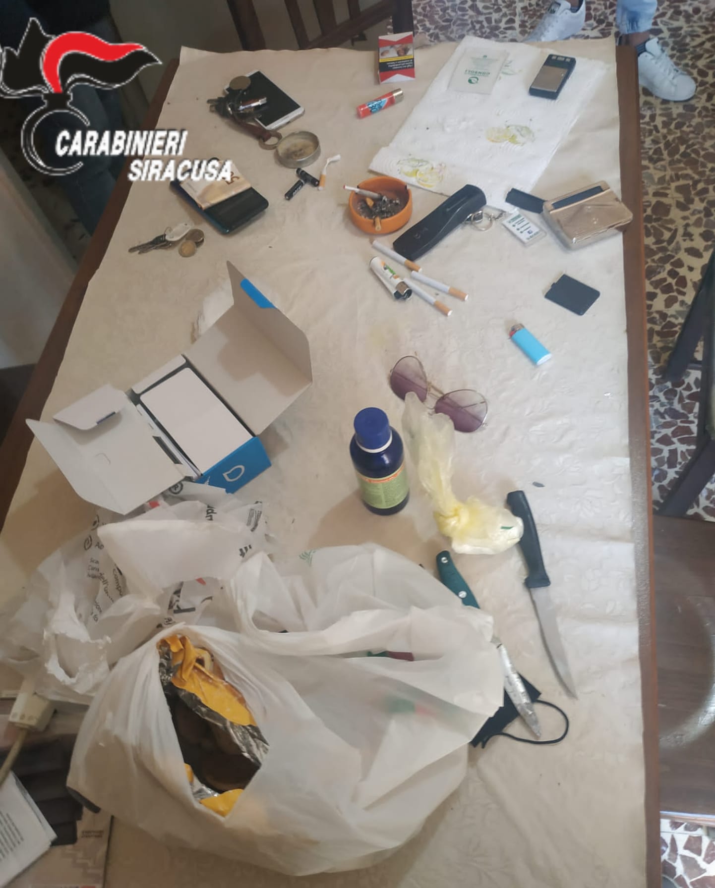 I Carabinieri hanno sfruttato l’improvvisa uscita dall’abitazione di uno dei tre, tale P. J., ventenne siracusano noto per precedenti di polizia anche in materia di stupefacenti, per intervenire e fare irruzione all’interno dell’appartamento: qui, in cucina, si trovavano M. M., classe 1971, proprietario dell’abitazione, e I. R., classe 2000, mentre tagliavano e confezionavano stupefacente ancora seduti ad un tavolo “apparecchiato” sul quale i Carabinieri hanno rinvenuto: