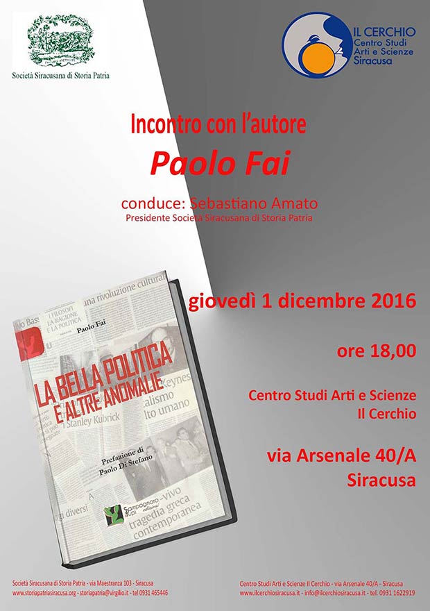 News Siracusa: un’antologia di articoli tratti da testate nazionali e locali che l’autore commenta con passione e competenza. “La bella politica e altre anomalie” di Paolo Fai, verrà presentato giovedì 1 dicembre, alle ore 18.00 presso la sede del Centro Studi Arti e Scienze il Cerchio di via Arsenale 40/A. Alla presentazione, moderata dal presidente di Società Siracusana di Storia Patria Sebastiano Amato, parteciperà l’autore del volume, edito da Sampognaro & Pupi.