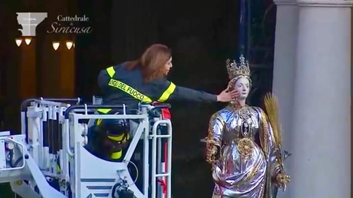 Il Simulacro argenteo della “santuzza” tanto amata dai siracusani e non solo si è affacciato sul sagrato della Cattedrale ed ha ricevuto un omaggio da parte dei Vigili del Fuoco di Siracusa.