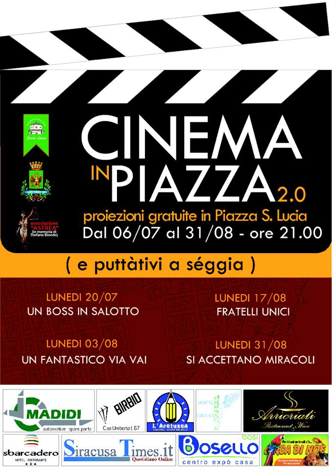 News Siracusa: Dopo il grande debutto di lunedì scorso, con il film “Andiamo a quel paese” di Ficarra e Picone, viene ufficializzata la programmazione del Cinema in Piazza 2.0. L’iniziativa, organizzata dal Consiglio di quartiere Santa Lucia in collaborazione con l’associazione Astrea ed il Comune di Siracusa si svolgerà, come già noto, da luglio ad agosto in piazza Santa Lucia.