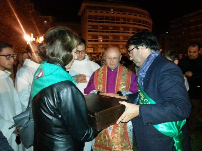 Subito dopo,accompagnate dal suono delle campane a festa, le reliquie sono state consegnate da Mons. Giansiracusa alla Deputazione, in Piazza San Giovanni, dopo una breve processione.