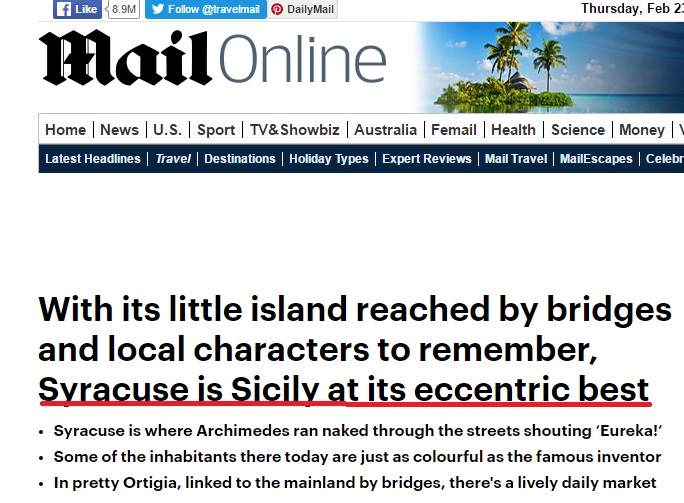 Articoli del genere sono una “boccata d’ossigeno” per la città aretusea, ma in fondo raccontano l’impegno e il lavoro dei cittadini che contribuiscono a rendere unica l’esperienza siracusana. Non solo storia del passato, ma anche chiese, musei, folklore e tanto altro ancora. Nell’articolo del Daily Mail si elogia Siracusa, nell’osservare l’autenticità dei siracusani che attraverso il loro impegno e le loro attività sono i protagonisti di questa eccellenza, oggi tanto amata e invidiata. Dice Kate Jhonson nel suo articolo: «Some of the inhabitants there today are just as colourful as the famous inventor», in sostanza: i siracusani sono oggi eccentrici e creativi come lo era, in fondo, il genio di Archimede.
