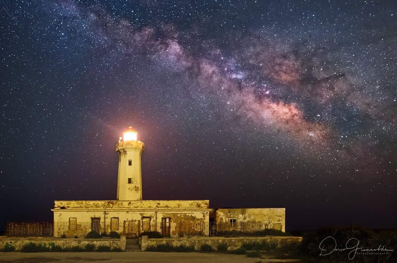 Dario ci racconta: “Non è semplice catturare la Via Lattea in zone affette dall’inquinamento luminoso, ciò nonostante, la riserva del Plemmirio offre un cielo adeguatamente buio da garantirel’opportunità ai più volenterosi di tentare lo scatto. Riprendere la Via Lattea alle spalle del faro è una ulteriore complicazione in quanto il faro tende ad abbagliare l’immagine riducendo il contrasto, schiarendo il fondo cielo e modificando i colori dell’immagine. Con un po’ di esperienza comunque lo scatto può essere realizzato come in questa immagine in cui è possibile osservare la Via Lattea nel suo splendore con: le nebulose il cui colore rosso è dovuto alla presenza di idrogeno, le zone più scure dovute alla presenza di polveri interstellari e le zone più chiare dovute agli addensamenti stellari”.