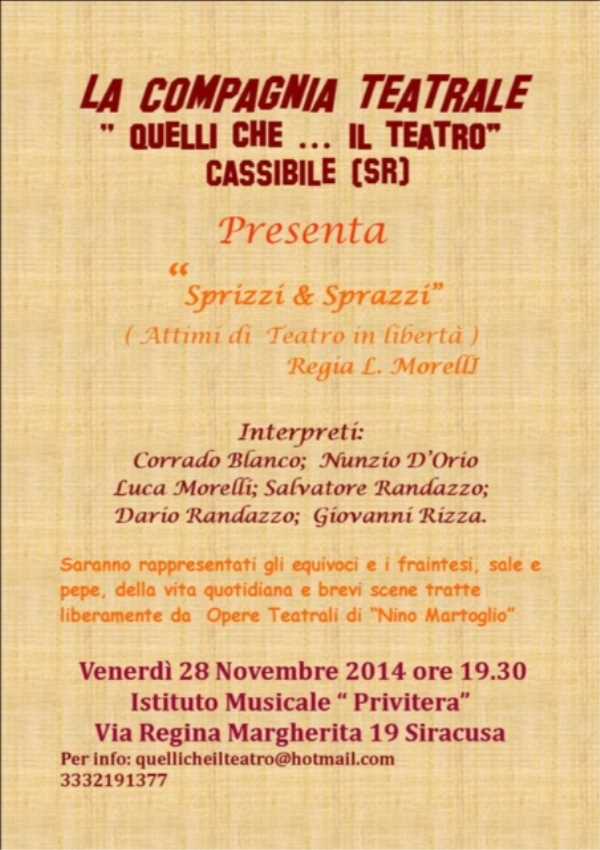 News Siracusa: il 28 novembre con inizio alle ore 19.30 nei locali dell’istituto musicale Comunale “Privitera” di Siracusa, La Compagnia “Quelli che…il teatro di Cassibile si esibirà in 90 esilaranti minuti, con scene di vita quotidiana e tratte dalla Centona di Nino Martoglio.