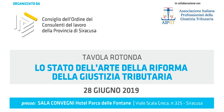 News Siracusa. “Lo stato dell’arte della riforma della giustizia tributaria”. Sarà questo l’argomento della tavola rotonda, organizzata per il prossimo 28 giugno, dalle ore 15 alle ore 18.30, all’Hotel Parco delle Fontane, dall’Ordine dei Consulenti del lavoro della Provincia di Siracusa in collaborazione con l’A.I.P.G.T., Associazione Italiana Professionisti della Giustizia Tributaria.