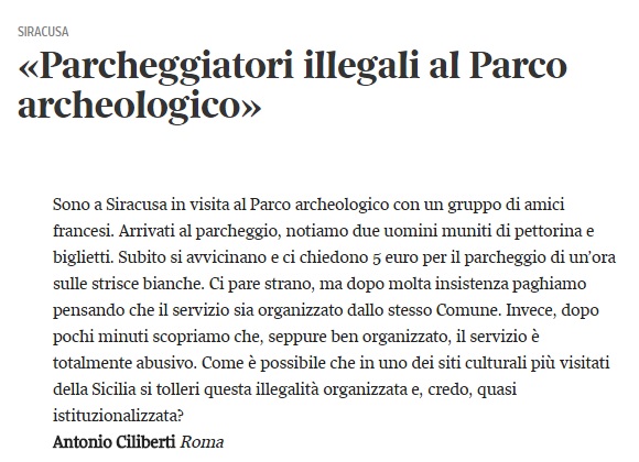 News: «Sono a Siracusa in visita al Parco archeologico con un gruppo di amici francesi. Arrivati al parcheggio, notiamo due uomini muniti di pettorina e biglietti. Subito si avvicinano e ci chiedono 5 euro per il parcheggio di un’ora sulle strisce bianche. Ci pare strano, ma dopo molta insistenza paghiamo pensando che il servizio sia organizzato dallo stesso Comune. Invece, dopo pochi minuti scopriamo che, seppure ben organizzato, il servizio è totalmente abusivo. Come è possibile che in uno dei siti culturali più visitati della Sicilia si tolleri questa illegalità organizzata e, credo, quasi istituzionalizzata?». Le parole di un turista amareggiato finiscono in una lettera pubblicata lo scorso 15 luglio sul Corriere della Sera. Una vacanza resa indimenticabile anche dal fenomeno dell’abusivismo nelle zone di sosta al Parco Archeologico di Siracusa. Nonostante gli interventi delle Forze dell’Ordine, le segnalazione dei rappresentati della circoscrizione Neapolis e di tutti i cittadini aretusei, il fenomeno illecito sembra persistere. Le soluzioni ci sono e sono state proposte, purtroppo si ritarda nel concretizzarle. In attesa di un riscontro, turisti e siracusani pagheranno un dazio salatissimo all’efficiente eppure illegale sistema di parcheggio in città.
