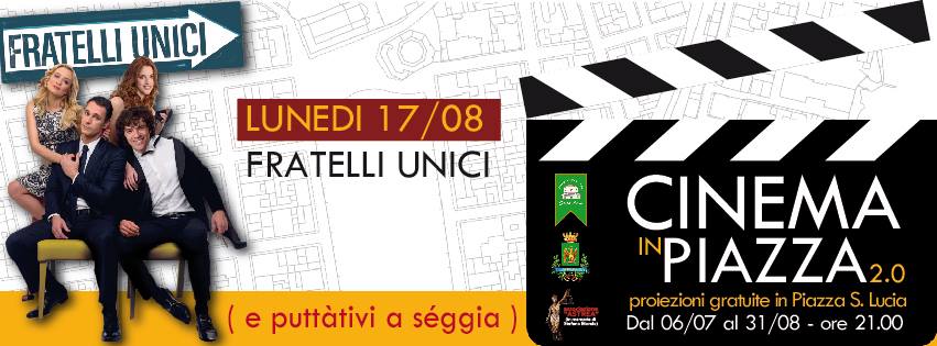 Dopo il successo di “Andiamo a quel paese”, film girato a Siracusa e provincia, “Un boss in salotto” ed “Un fantastico via vai”, toccherà all’opera cinematografica “Fratelli unici” far divertire il fedelissimo pubblico del Cinema in Piazza, giunto alla sua seconda edizione. Il film vedrà protagonisti la bellissima Carolina Crescentini, Miriam Leone, ex Miss Italia siciliana, e gli amatissimi Raoul Bova e Luca Argentero che interpreteranno il ruolo di due fratelli costretti ad una convivenza che porterà ad una serie di conseguenze tragicomiche.