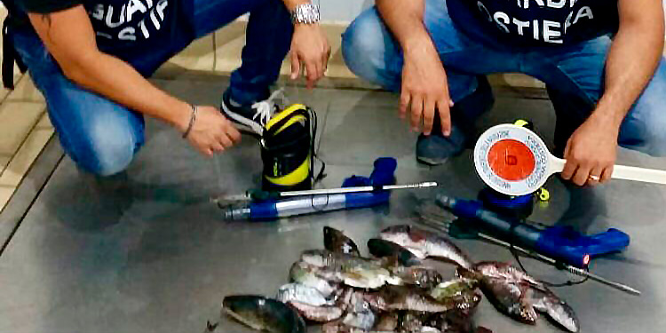 La circostanza ha insospettito i militari operanti, facendo ritenere riconducibile la presenza dell’autovettura alla presenza di qualche pescatore di frodo. Dopo qualche minuto infatti sono stati individuati due fasci di luce risalenti dal mare in direzione dell’autovettura, e successivamente, la presenza di due sub che si accingevano a posizionare il pescato e l’attrezzatura utilizzata all’interno del bagagliaio dell’auto.