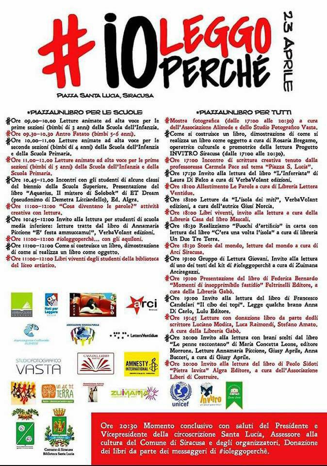 La giornata mondiale del libro di domani 23 Aprile, interesserà anche la città di Siracusa attraverso una serie di eventi promossi da diversi enti, tra cui la Circoscrizione Santa Lucia, la Biblioteca Santa Lucia, il Coordinamento provinciale Nati per Leggere Siracusa, il Gruppo di lavoro del Progetto “In Vitro”, Zuimama Arciragazzi, l’Arci, il Centro Pio La Torre, l’Associazione Astrea in memoria di Stefano Blundo, l’Associazione Alimede, la Libreria Un Due Tre Terra, la Libreria Lettera Ventidue, Verba Volant Edizioni, l’associazione Liberi di costruire, Amnesty International Siracusa, La casa del libro Mascali, Rosaria Bregamo, Luciano Modica, Stefano Amato, Luca Raimondi, Giusy Aprile, lo Studio fotografico Vasta e la Biblioteca Provinciale “E. Vittorini”.