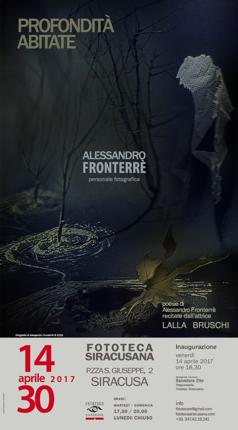 Per Alessandro Fronterrè la fotografia è un meditational instrument, come l’ha definita LyleRexer (The Edge of Vision) una ricerca di risposte sui grandi misteri dell’essere rivolta all’uomo-spettatore, soggetto della percezione e interprete del suo lavoro. Nonostante lasensazione d’irrealtà e di spaesamento, il lavoro di Fronterrè è in grado di attrarre inevitabilmente l’osservatore, di trascinarlo in un contatto irresistibile, in quanto vitale, dentro le profonde atmosfere evocate che rimandano a stati pre-natali, a livelli inesplorati del nostro subconscio. Cupi scenari fisicamente e non metafisicamente intesi secondo la nostra esperienza, costituiscono il fil rouge delle “Profondità abitate”, lo stimolo, ma anche la grande ossessione.