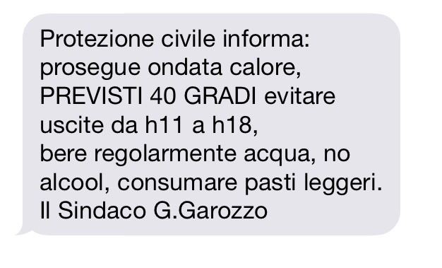 News Siracusa: la Protezione Civile di Siracusa ha allertato i cittadini tramite il nuovo servizio di sms del comune di Siracusa, sull’ondata di caldo prevista per la giornata odierna. Questo il testo del messaggio: “prosegue ondata calore, PREVISTI 40 GRADI evitare uscite da h11 a h18, bere regolarmente acqua, no alcool, consumare pasti leggeri. Il Sindaco G. Garozzo”.