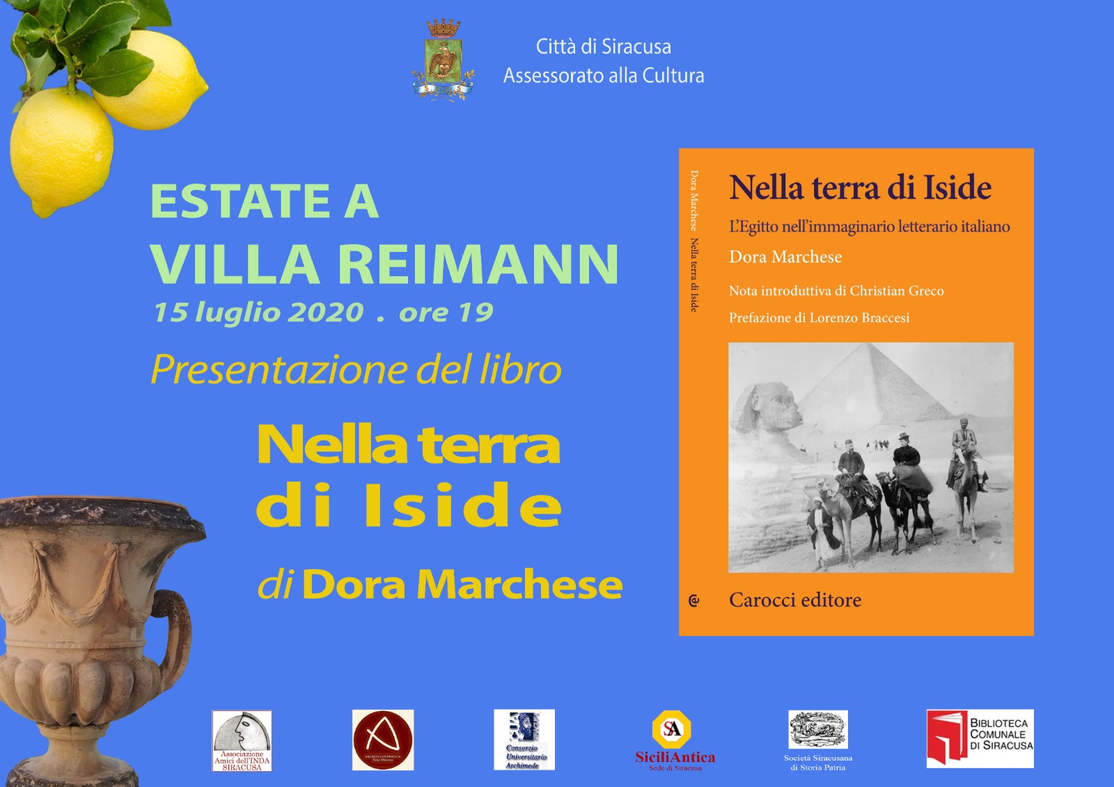 Mercoledì 15 luglio alle 19, sarà presentato il libro “Nella terra di Iside”. L’Egitto nell’immaginario letterario di Siracusa di Dora Marchese,edito da Carocci. La presentazione del libro rientra nell’ambito della rassegna “Estate a Villa Reimann”, organizzata dall’assessorato alle Politiche culturali in collaborazione con la Biblioteca comunale, Sicilia Antica, Archeoclub, associazione Amici dell’Inda, Consorzio Universitario Archimede e Società Siracusana di Storia Patria, si avvale della prefazione di Lorenzo Braccesi e della nota introduttiva di Christian Greco.