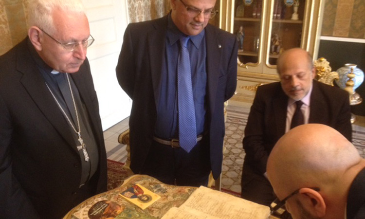 Simbolicamente è stato il presidente della Banca, Arturo La Vignera, a consegnare il prezioso documento all’arcivescovo mons. Salvatore Pappalardo. “Abbiamo a cuore la crescita responsabile e coesa delle Comunità di cui siamo espressione ed in cui operiamo, dando anche voce, con il giusto sostegno, alle iniziative che richiamano alle loro più genuine tradizioni e memorie affinché esse possano essere tutelate e rinnovate, nella consapevolezza che ciò è utile ai Territori quanto l’attività caratteristica della nostra Banca” ha detto il presidente La Vignera, che ha aggiunto: “valuteremo con la dovuta sensibilità iniziative analoghe in segno di vicinanza ai nostri Territori ed all’insegna della fitta trama di relazioni sociali che caratterizza il nostro impegno, ormai quasi centenario, sempre improntato sui principi della mutualità e del localismo”.