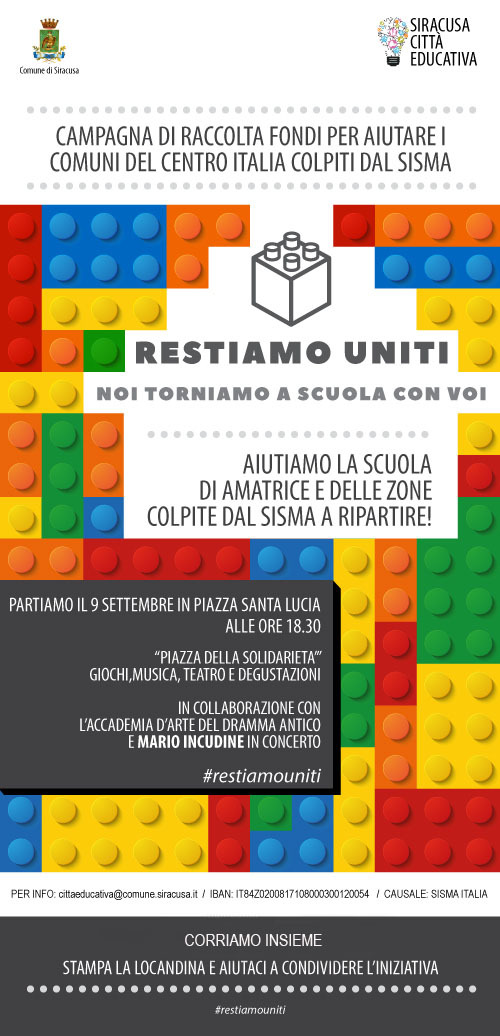 L’ evento, ideato da “Siracusa città educativa” e da scuole ed associazioni cittadine, e realizzato in collaborazione con l’Accademia d’Arte del Dramma Antico, prevede vari momenti culturali e di intrattenimento, con giochi, musica, teatro, degustazione, del piatto simbolo della città colpita dal sisma, la “Amatriciana” che Giovanni Guarneri del ristorante “Don Camillo” preparerà insieme ad altri chef e ai ragazzi dell’Istituto Alberghiero. In chiusura il concerto di Mario Incudine.