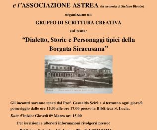 News Siracusa: anche quest’anno la Biblioteca S. Lucia, su iniziativa della bibliotecaria Luciana Pannuzzo, continua a promuovere attività volte a favorire la promozione della cultura e la socializzazione in biblioteca. In particolare per il prossimo mese saranno previste le seguenti attività: gruppo di Scrittura Creativa sul tema “Dialetto, storie e personaggi tipici della Borgata siracusana”. Il progetto partirà il 9 marzo dalle 15.00 alle 17.00. L’idea nasce dal desiderio di parecchi utenti della Biblioteca di voler scrivere fatti ed eventi particolari, personaggi tipici di un quartiere come questo tanto ricco di storia quanto, purtroppo, ancora poco considerato. I racconti potranno essere narrati sia in italiano che nel nostro dialetto, al fine di rivalutarne uso e tradizione. A guidare il gruppo ci sarà il Prof. Gesualdo Scirè.