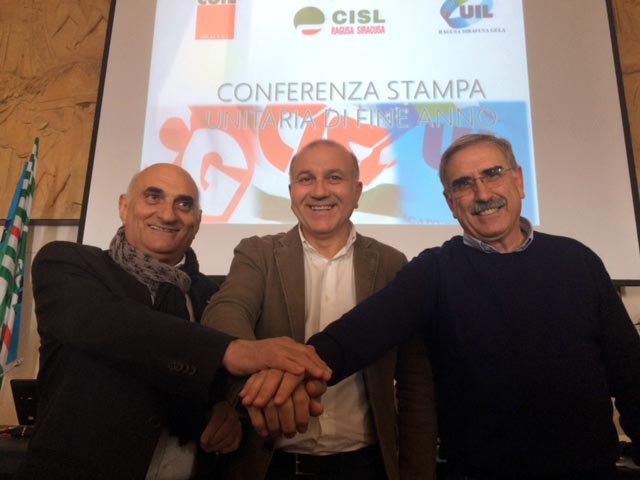 News Siracusa: CGIL, CISL e UIL serrano le fila ed aprono insieme una straordinaria, e per certi versi inedita, stagione di vertenzialità unitaria. È questo l’elemento dirompente per il 2016 che scuote il torpore e la stagnazione di un contesto territoriale profondamente aggredito da un anno appena trascorso segnato da una crisi occupazionale e sociale senza precedenti. Alla coesione ritrovata a livello nazionale sul rinnovo dei contratti nazionali e sulla modifica della Legge Fornero sulle pensioni, si è aggiunta forte condivisione a livello territoriale sancita dalla iniziativa unitaria del 31 ottobre scorso in largo XXV luglio.