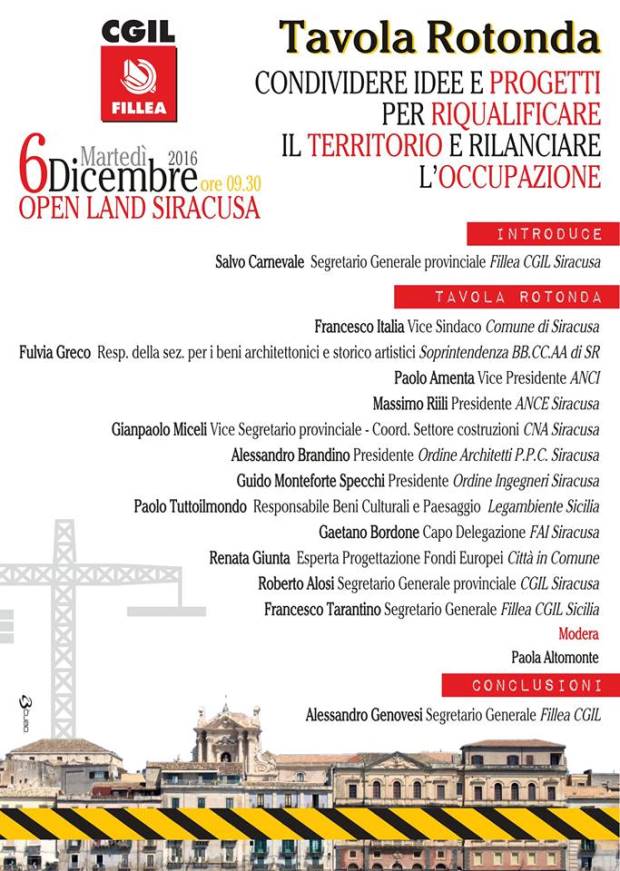 News Siracusa: una tavola rotonda con l’obiettivo di mettere in rete idee, esperienze e progetti. L’incontro, promosso dalla Fillea-Cgil di Siracusa dal titolo “Condividere idee e progetti per riqualificare il territorio e rilanciare l’occupazione” si terrà martedì 6 dicembre alle ore 9.30 all’Open Land.