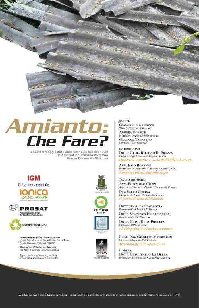 News Siracusa: l’Associazione Rifiuti Zero Siracusa e l’Ordine dei Chimici di Siracusa organizzano sabato 9 maggio dalle ore 16.30 alle ore 19.30 presso il salone Borsellino di Palazzo Vermexio, Piazza Duomo, il seminario dal titolo “Amianto: CheAd un anno dalla approvazione della legge regionale 10/2014 sull’amianto, gli esperti coglieranno l’occasione per confrontarsi e discutere sullo stato dell’arte. Si affronteranno le criticità ed i problemi presenti nel territorio siracusano. Il convegno, sarà moderato da Salvo La Delfa, presidente dell’associazione Rifiuti Zero Siracusa. Durante il convegno avranno luogo gli interventi del dott. Rosario Di Prazzadirigente responsabile dell’ufficio regionale Amianto, e dell’avv. Ezio Bonanni, presidente dell’Osservatorio Nazionale Amianto.
