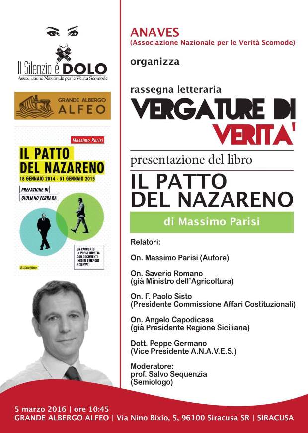 La rassegna si aprirà con la presentazione del libro di grande attualità “Il patto del nazareno“, alla quale prenderanno parte l’autore On. Massimo Parisi ed altri illustri ospiti come l’On. Saverio Romano, ex Ministro dell’Agricoltura, l’On. Francesco Paolo Sisto, Presidente della Commissione Affari Costituzionali della Camera dei Deputati, l’On. Angelo Capodicasa, ex Presidente della Regione Sicilia ed il dottor Peppe Germano, Vicepresidente A.NA.VE.S. A moderare l’incontro il professore Salvo Sequenzia, noto semiologo aretuseo.