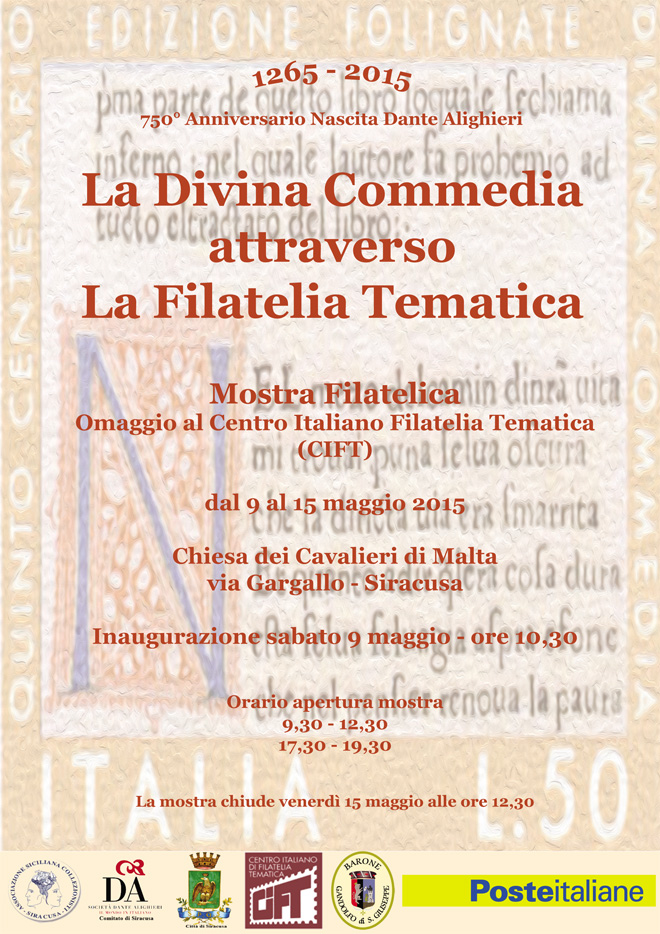 News Siracusa: sarà inaugurata, stamattina alle 10.30 presso la Chiesa dei Cavalieri di Malta, la mostra filatelica, in occasione del 750° anniversario della nascita del padre della lingua italiana e autore della Commedia che Boccaccio definì Divina, Dante Aligheri.