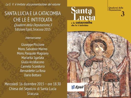 News Siracusa: domani, alle ore 18.30, presso la Chiesa del Sepolcro di Santa Lucia, sarà presentato il terzo Quaderno della Deputazione della Cappella di Santa Lucia, dal titolo Santa Lucia e la catacomba che le è intitolata a cura dell’associazione Cultur’Arte Santa Lucia, edizioni Epsil.