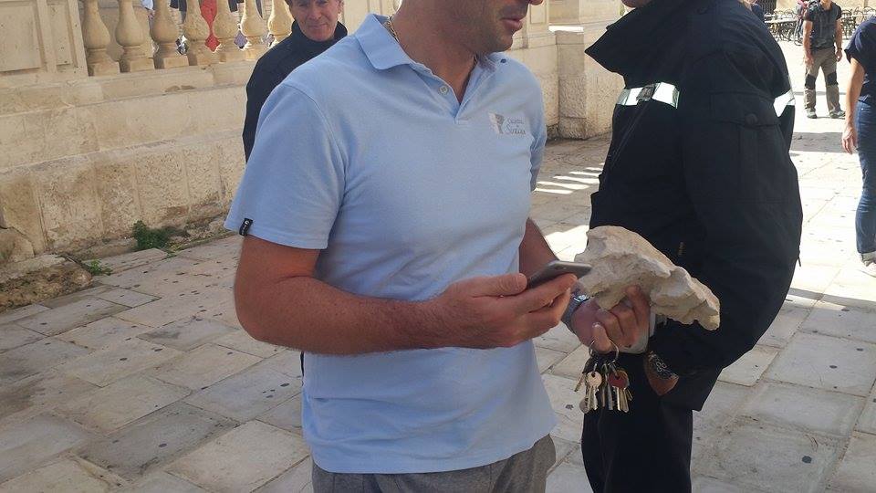 News Siracusa: un pezzo di foglia d’acanto scolpita sui capitelli della facciata del Duomo si è staccata. Pare, però, non si sia il rischio di un ulteriore distacco di altri elementi.